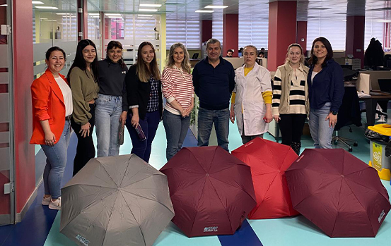 Bugün, 8 Mart Dünya Kadınlar Günü'nü kadınlarımızın gücünü ve katkılarını takdir etmek için özel bir etkinlik düzenledik. Onların değerli katkılarını kutlamak adına, her bir kadın çalışanımıza özel olarak hazırladığımız şemsiyeleri hediye ettik. Bu küçük jestle, kadınlarımızın her zaman yanlarında olduğumuzu ve onların değerini bildiğimizi göstermek istedik. Şirketimizin başarısında kadınlarımızın önemli rol oynadığının farkındayız ve onların iş hayatındaki başarılarına destek olmaya devam edeceğiz. Hep birlikte daha güçlü ve eşit bir gelecek için çalışmaya devam ediyoruz!