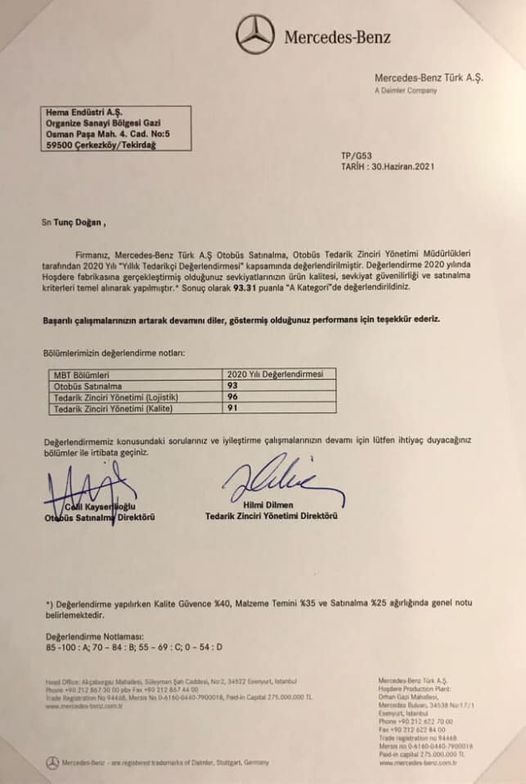 Daimler Mercedes tarafından yapılan performans değerlendirmesinde Şirketimiz A kategorisinde puan almıştır.Emeği geçen tüm çalışanlarımıza teşekkür ederiz.